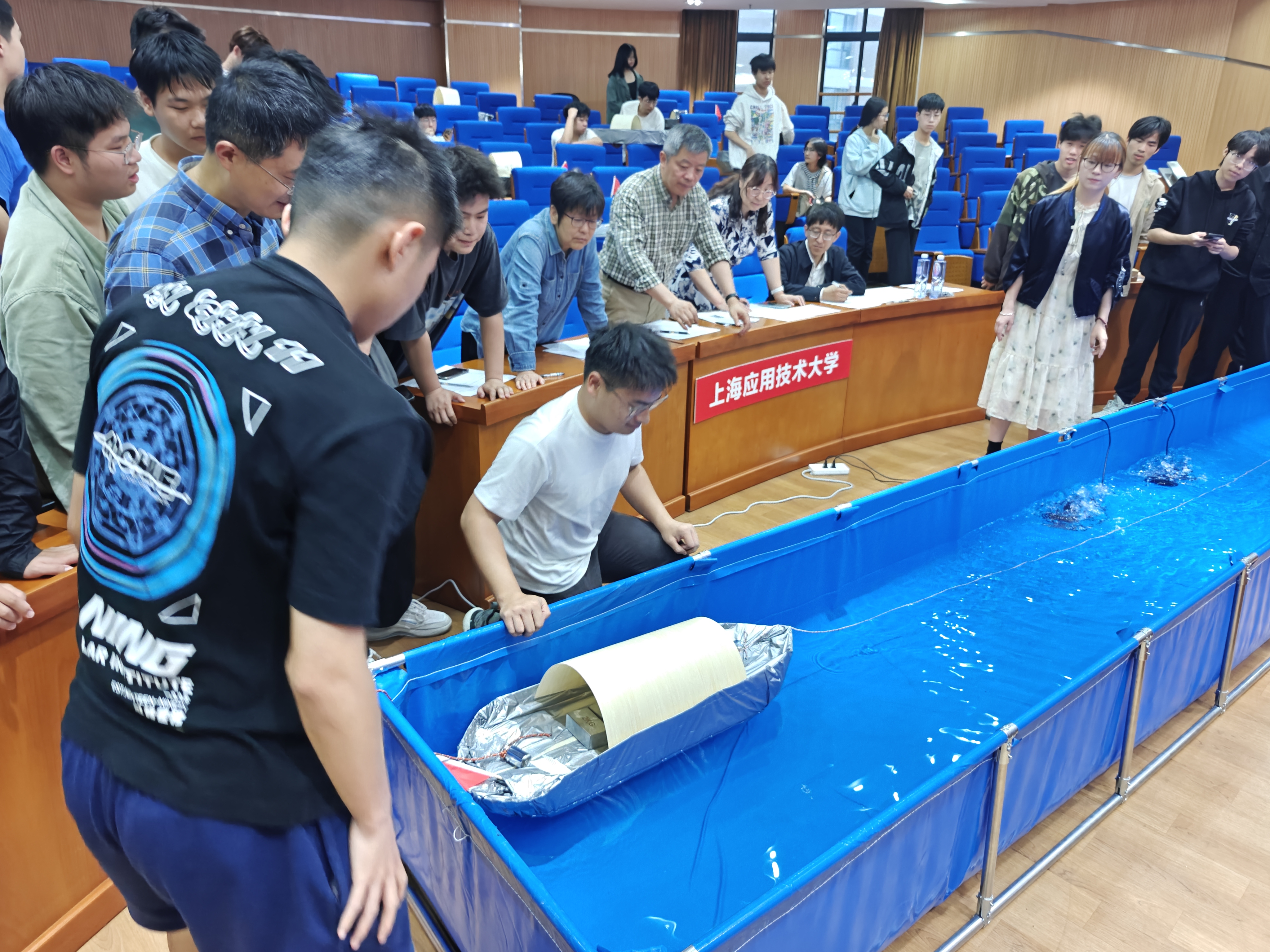 加载评分环节于5月12日晚在六科B210室展开。竞赛评分分为模型检查15分、模型介绍5分以及加载表现80分和违规罚分组成,共计100分。比赛伊始,参赛选手们首先完成模型称重,随后用一分钟时间清晰阐述模型设计的理念,从设计思路、结构特点到创新之处,都进行了详细介绍。接着,模型通过规避区测试,确保尺寸参数符合参赛规格。加载环节无疑是整个竞赛最扣人心弦的部分,分为三级加载。第一级加载载重0.5kg放置船头指定位置,计时10s;第二级加载在船尾指定位置载重0.5kg,同时船中部指定位置载重6.0kg,计时10s;第三级加载中部指定位置载重4.0kg,开启造浪泵,牵引船体完成三级赛道的航行。加载总时长限制为4min,评委们根据模型外观、理论陈述和加载表现等多维度进行综合打分,最终评选出优胜队伍。