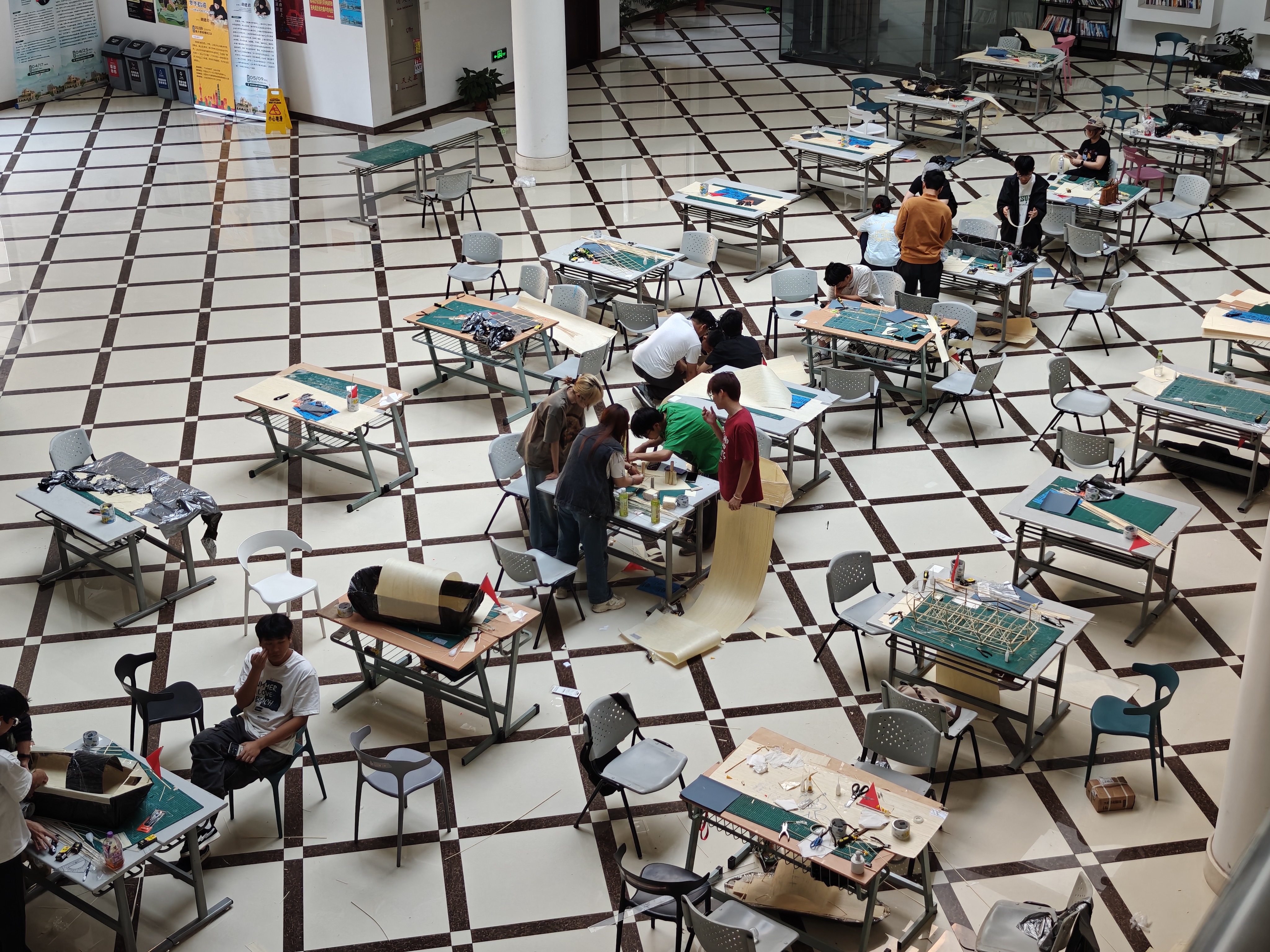 模型制作环节于奉贤校区第六学科楼一楼大厅火热开展,各参赛小组在限定时间内完成了独具特色的乌篷船模型。经过长达22h的不懈努力,各小组的乌篷船模型纷纷精彩亮相。这些模型不仅体现了传统乌篷船的经典造型,还融入了现代工程理论,展现了学生们在轻量化、抗荷载和可持续材料应用上的创新思考。有的模型注重船体流线型设计,有的则强化了抗撞击性能,充分展现了同学们丰富的想象力和创造力,也让整个赛场洋溢着城建学院土木工程专业的浓厚文化气息。
